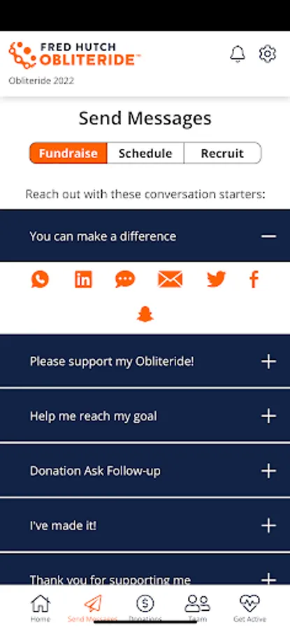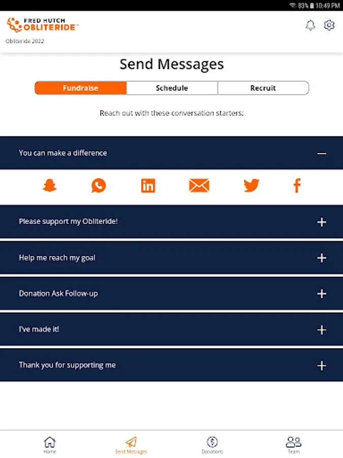 Do your fundraising on the go with your Obliteride application. Update your fundraising page, send emails, check your progress connect to Google Fit to track your physical activity with other event name participants and teams – all from the palm of your hand. The Obliteride application is a great tool to track your fundraising progress, and to keep current on all Obliteride news!