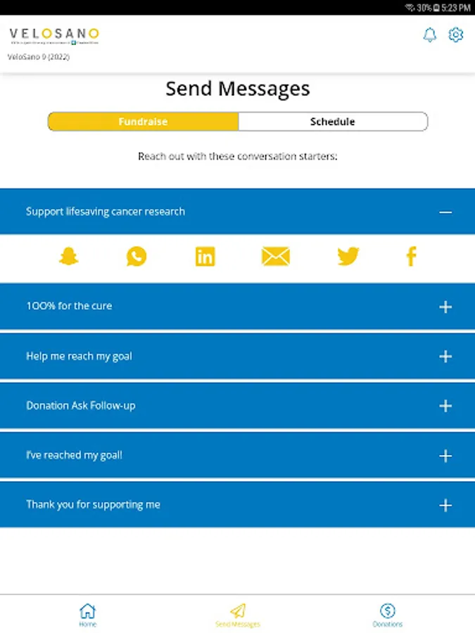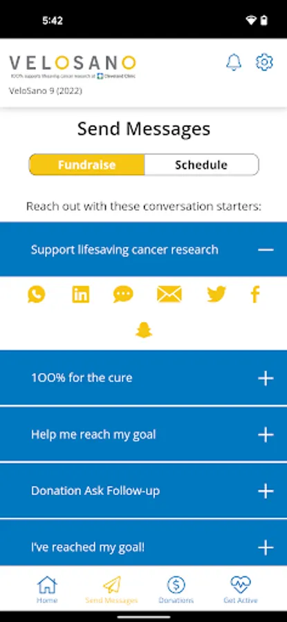 Fundraise on the go for cancer research at Cleveland Clinic with the VeloSano App. Monitor your progress, send emails, social share, and connect to Apple Health/Google Fit/Fitbit/Garmin/Strava to track your physical activity with other VeloSano participants and teams - all from the palm of your hand.