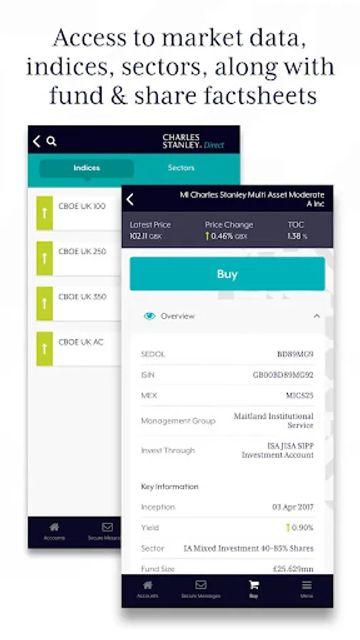 - Access to market data. Indices, sectors along with fund & share factsheets.