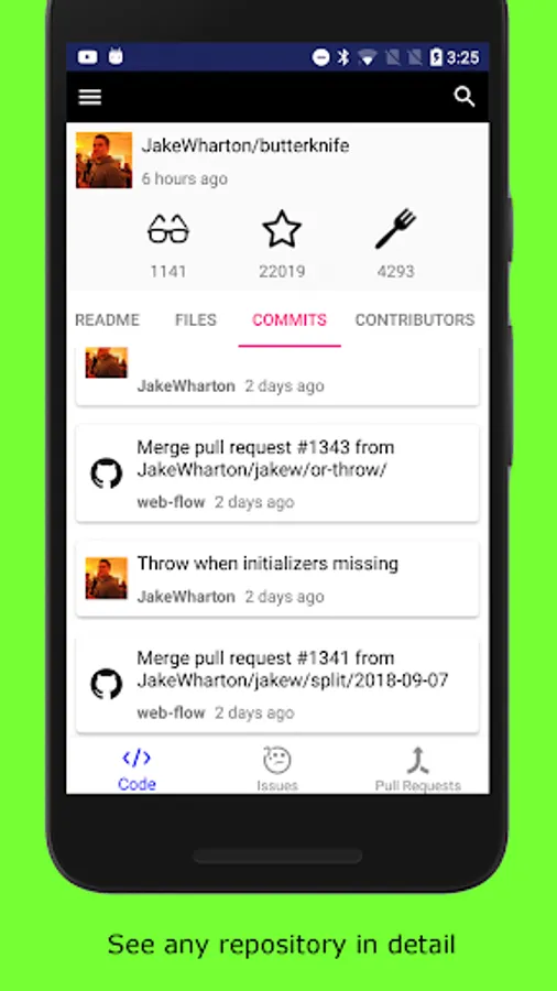 • View comments, events and other details for commits, pull requests and issues