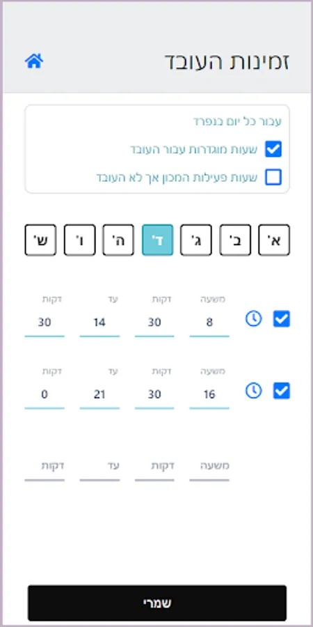 אתם קובעים את שעות הפעילות של המכון ושל כל עובד בנפרד (ימים וחלונות זמן במשך היום)