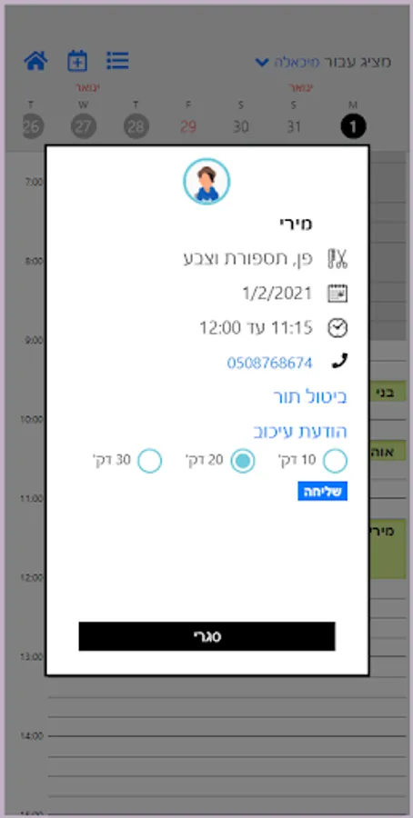 יכולת לבטל תור ושליחת התראה ללקוח