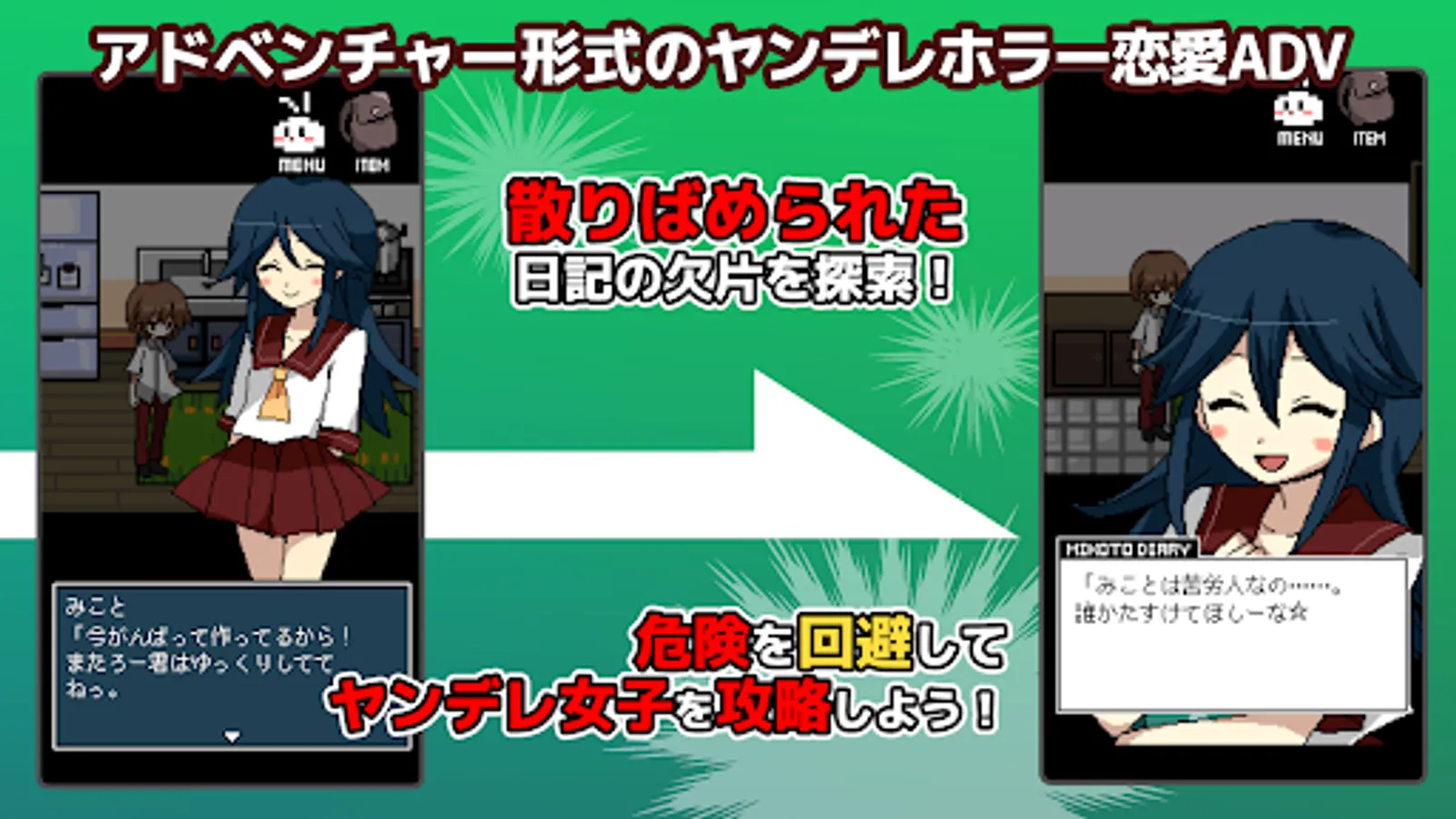 Suspense and Psychological Horror: A girl's diary depicts spooky events and puzzling situations. Players will feel anxiety and psychological fear through her words and situations. By going deep into the darkness of the girl's heart, the player can feel the tension himself.