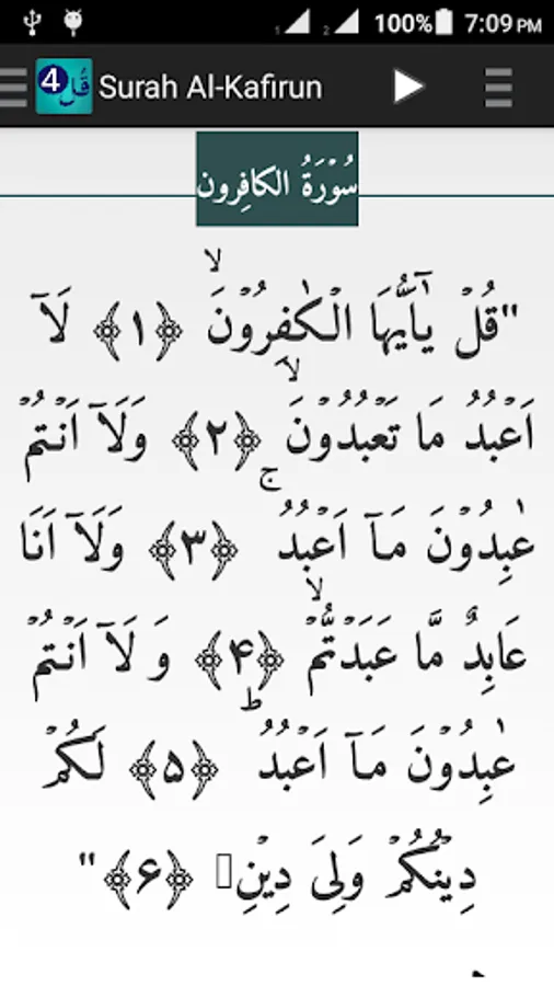 i.e. Al-Kafiroon, Al-Ikhlas, Al-Falaq and An-Nas + Al-Fatiha,Ayatul-Kursi. It lets Muslims all over the world recite, learn and listen to