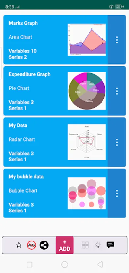 Chart Maker/Graph Maker allows you to create charts and graphs easily. You simply enter your data in a table and Chart Maker will create bar chart, pie chart, stack chart, line chart, area chart, radar chart or bubble chart for you.