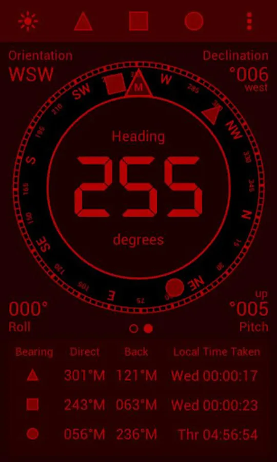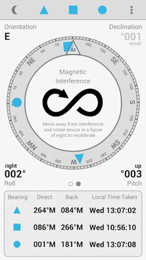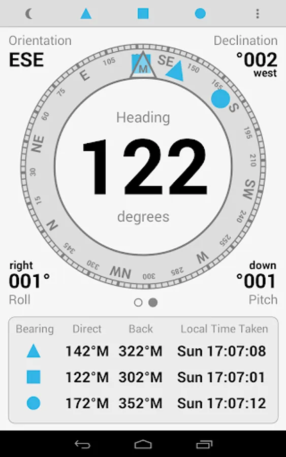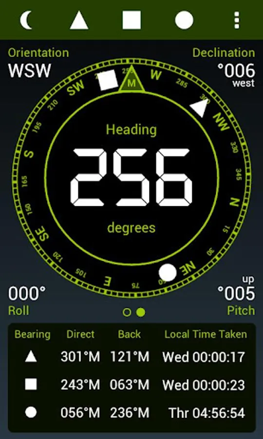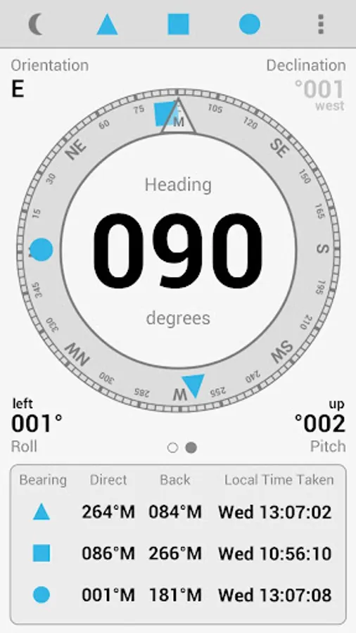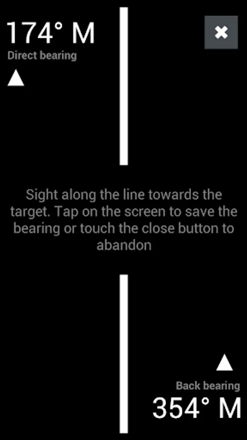 Record up to three compass bearings using the three middle buttons on the top tool bar. The bearings can be displayed around the compass and can be used to get a three point compass fix.