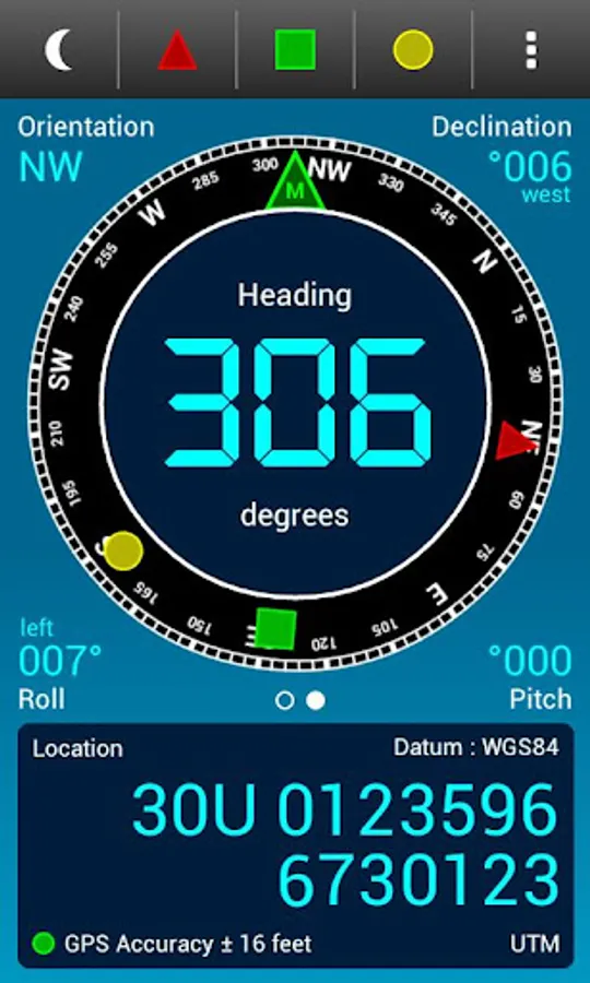 The app shows your heading on an analogue compass, together with a digital centre panel displaying your heading in degrees.