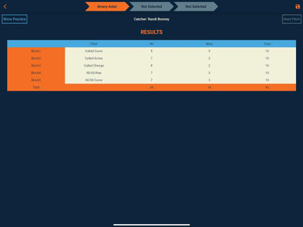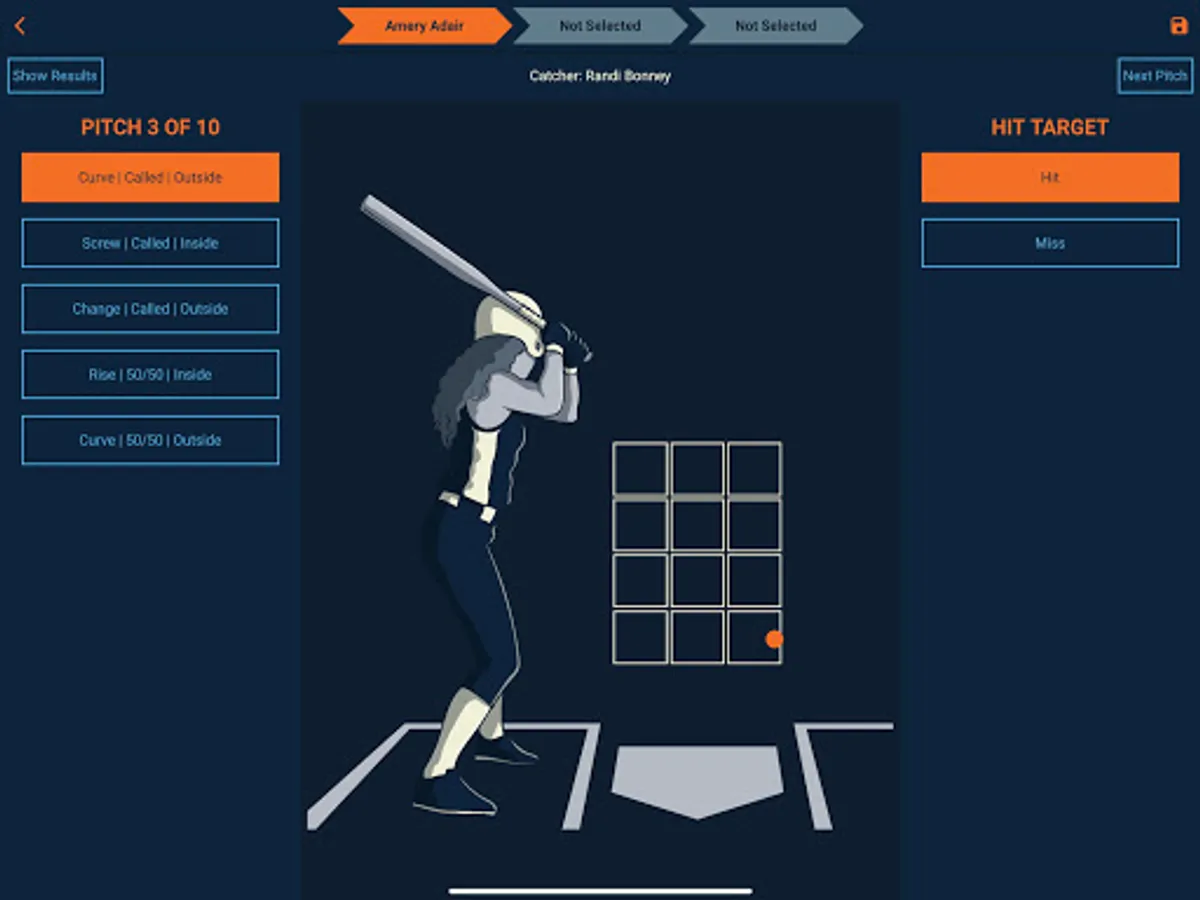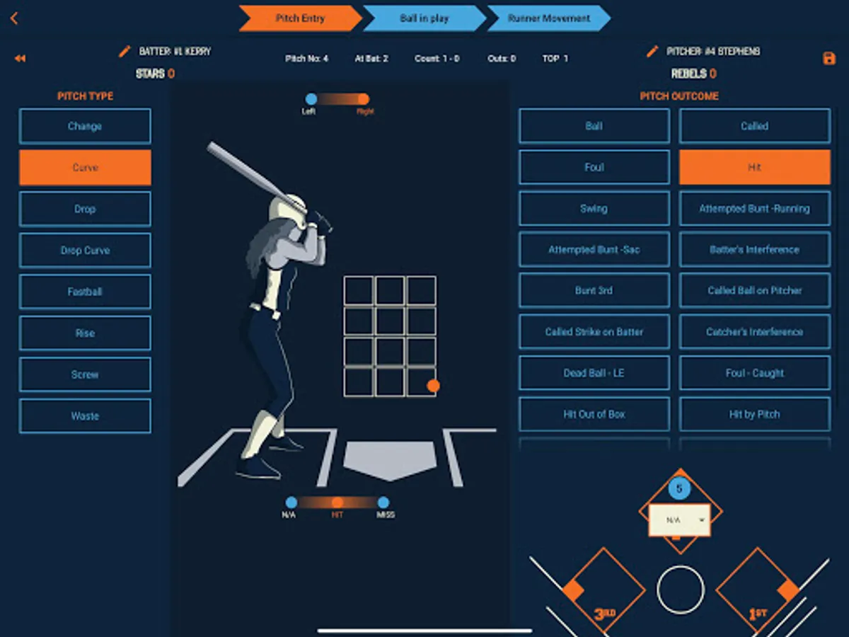 Facilitates manual recording of pitch type, zone location, hit or missed spot, ball or strike