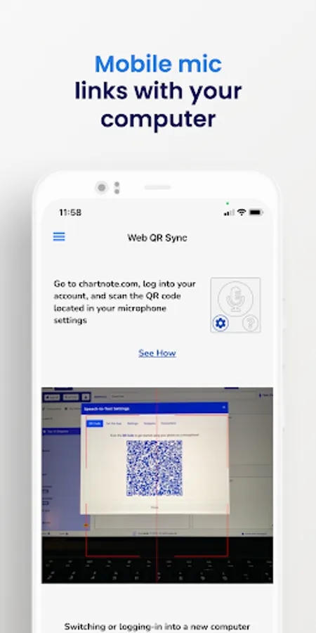 Once you create a free account, all the notes created on the app autosave and sync to the Chartnote web application. You can also use our Chartnote mobile app as a microphone to dictate your notes in our web app or directly to a web-based EHR through our Chartnote Chrome extension. Chartnote links your mobile device to your desktop using a special QR code generated by the web application (chartnote.com) or the Chrome extension.
