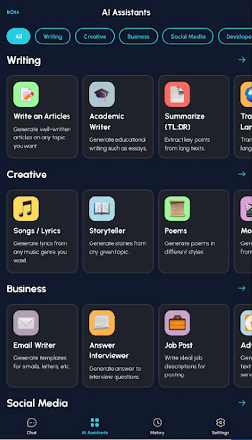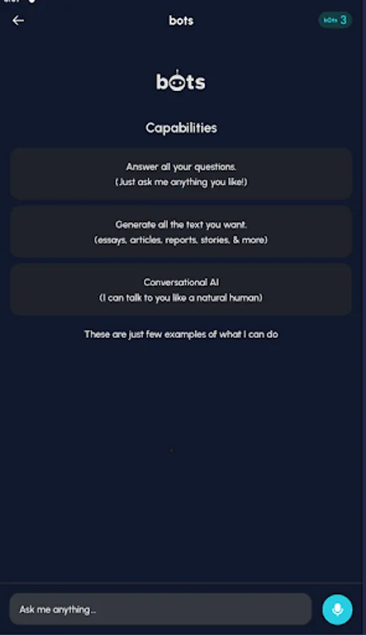Bots is an intelligent virtual assistant that engages in human-like conversations, providing instant answers to queries across various topics. Powered by advanced AI technology, this app delivers accurate responses, offers helpful suggestions, and adapts to users' preferences. With its user-friendly interface, Bots simplifies communication and enhances efficiency for users seeking instant information or simply looking for a friendly chat. Experience the future of smart chatbots with Bots! Download now!