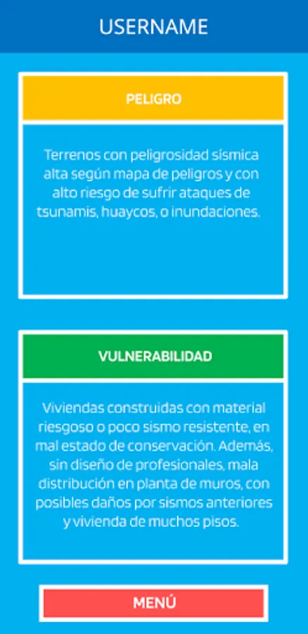 This application uses knowledge of civil and structural engineering to provide the Peruvian population with a qualitative diagnosis about the RISK, DANGER and VULNERABILITY of their homes. Using the theory of risk prevention and mitigation, the application uses the user's responses to, through the algorithm, calculate and provide information about the state of the properties.