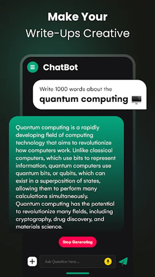 Chat AI is a handy smartphone app providing you a chatbot powered by ChatGPT API developed by Open AI. It will chat with you regarding any topic and provide you meaningful answers as chat GPT 4 powers it to do so. It allows you to ask AI as many things as you want. This AI chatbot app powered by open ai chat gpt will help you in various ways.