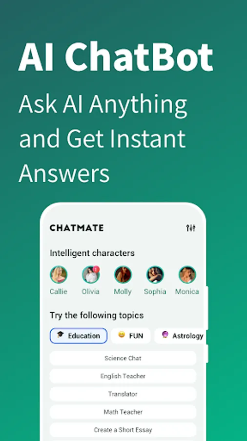 Experience the future of AI with ChatMate - the most advanced free AI chatbot on Google Play.