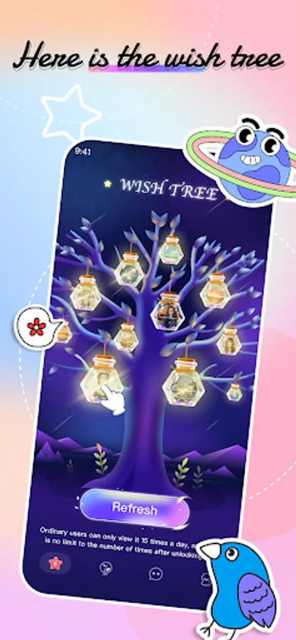 A. Wish Tree: Wow, you found a treasure! Here is the wish tree. People write their wishes on pieces of paper, and put them in bottles. Click on a bottle to open it to see what's inside!
