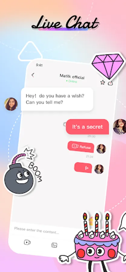 C. Live Chat: One of the most exciting functions of Diko is that you can instantly chat with people from all over the world. You can send text message with many fun emoticons, as well as pictures, videos, etc.