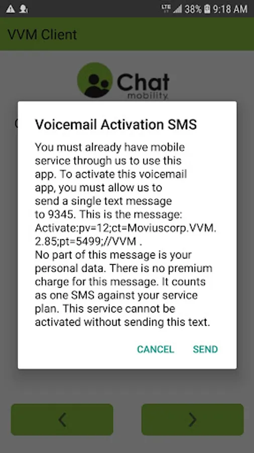 Send SMS – This allows the app to send an SMS to Chat Mobility at the following address: 9345. There is no charge for this SMS, although it counts against your plan limits. The SMS does not contain any of your personal data. Its purpose is to activate your client with the Chat Mobility voicemail server.