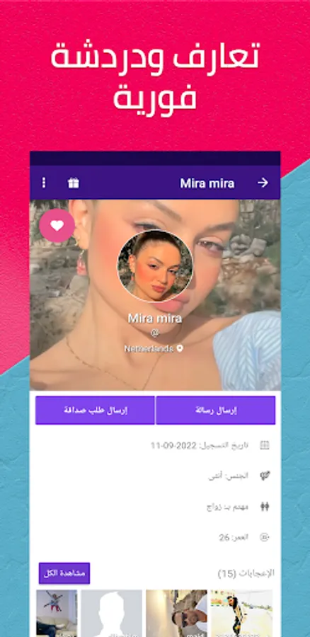 A written chat program and Arabic chat without currencies and a free marriage site that enables you to get acquainted with those close to you and also acquaintance with people around the world and correspondence with girls and guys from all Arab countries, such as dating Saudi Arabia, dating Morocco, dating Iraq program, dating Algeria, girls from Lebanon and Gulf youth And the acquaintance of the Emirates and Tunisia.