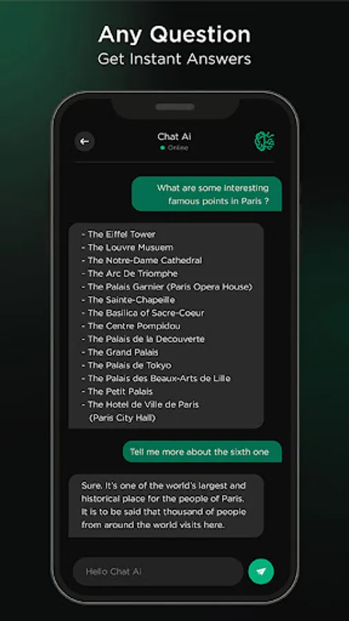 Your GPT-3, GPT-4 and ChatGPT-powered chat companion, AI Chat is ready to search any topic of interest. Whether it's sports, entertainment, politics, fashion, science, or anything else, AI Chat is always eager to chat.