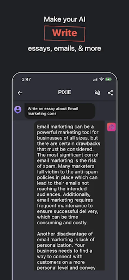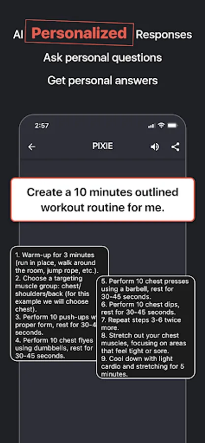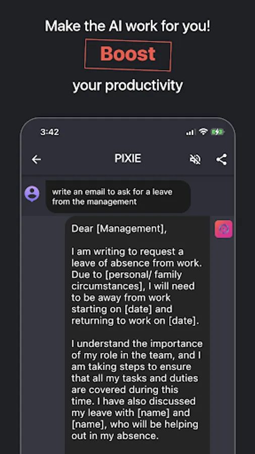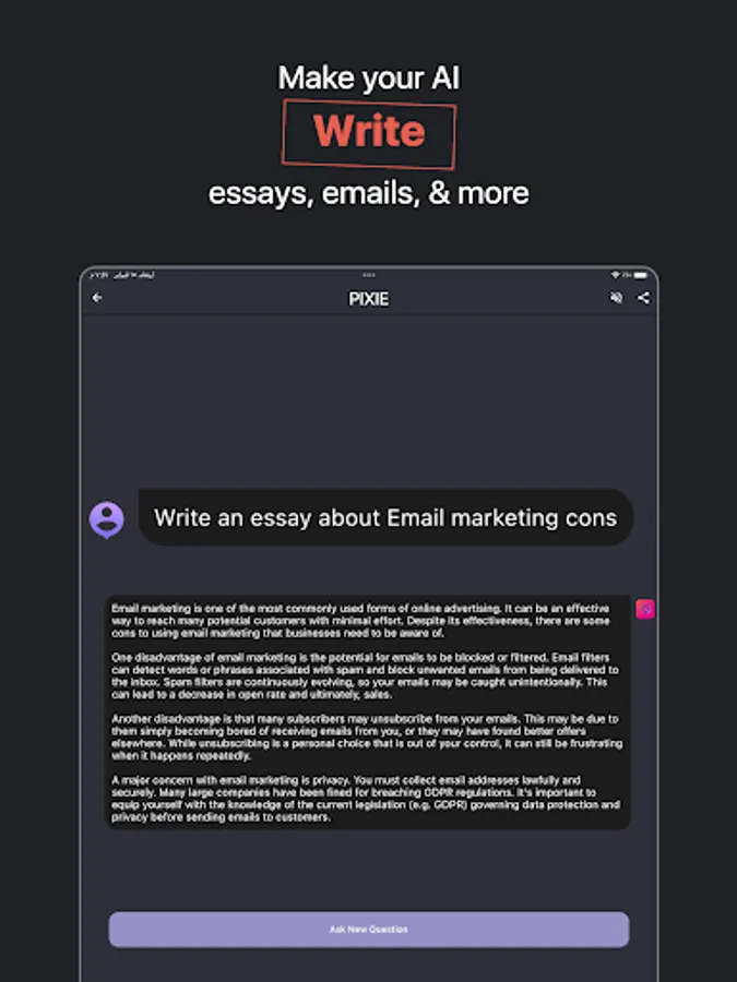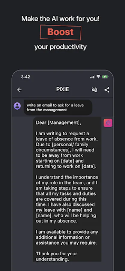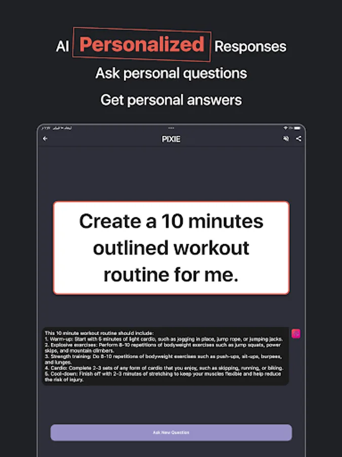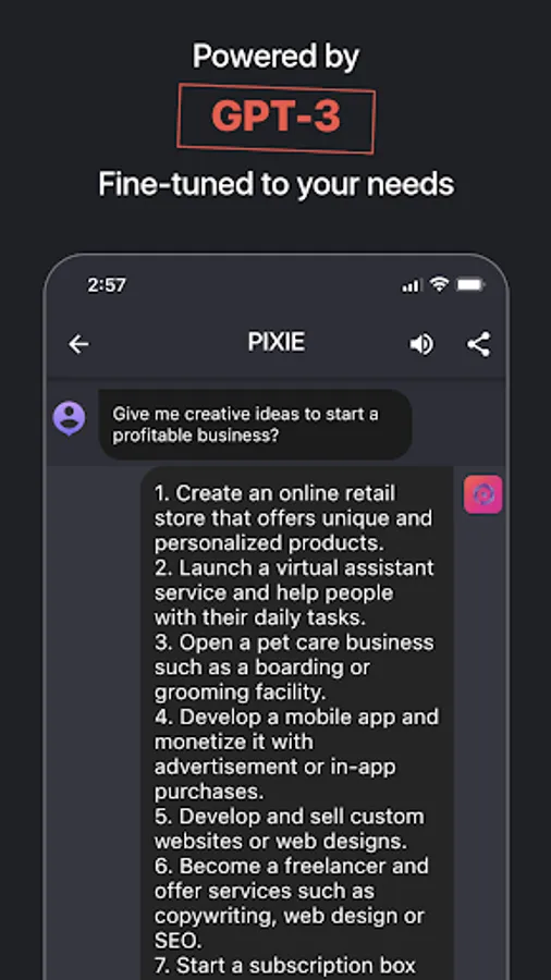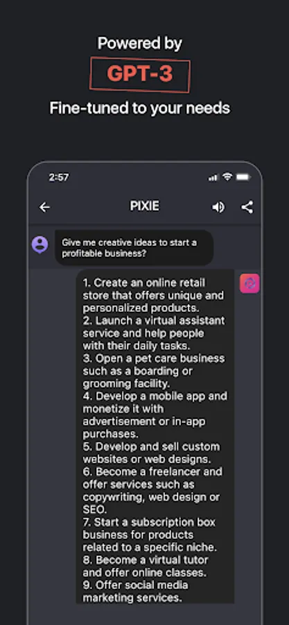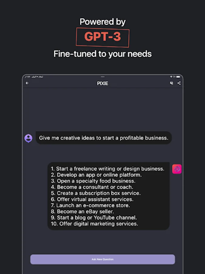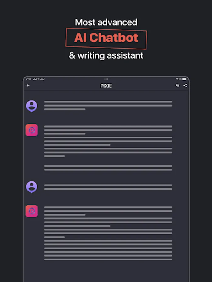 With Pixie, you can plan out your task, talk about any topic, engage in conversations with an AI you can't even notice that it's an AI, or even brainstorm ideas, or plan out your future. Pixie got you all covered.