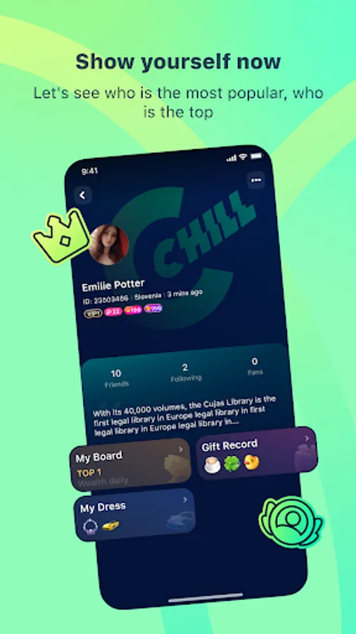 Show off your unique style with a variety of cool profile frames, flashy avatars, and personalized chat bubbles. Let your individuality shine through!