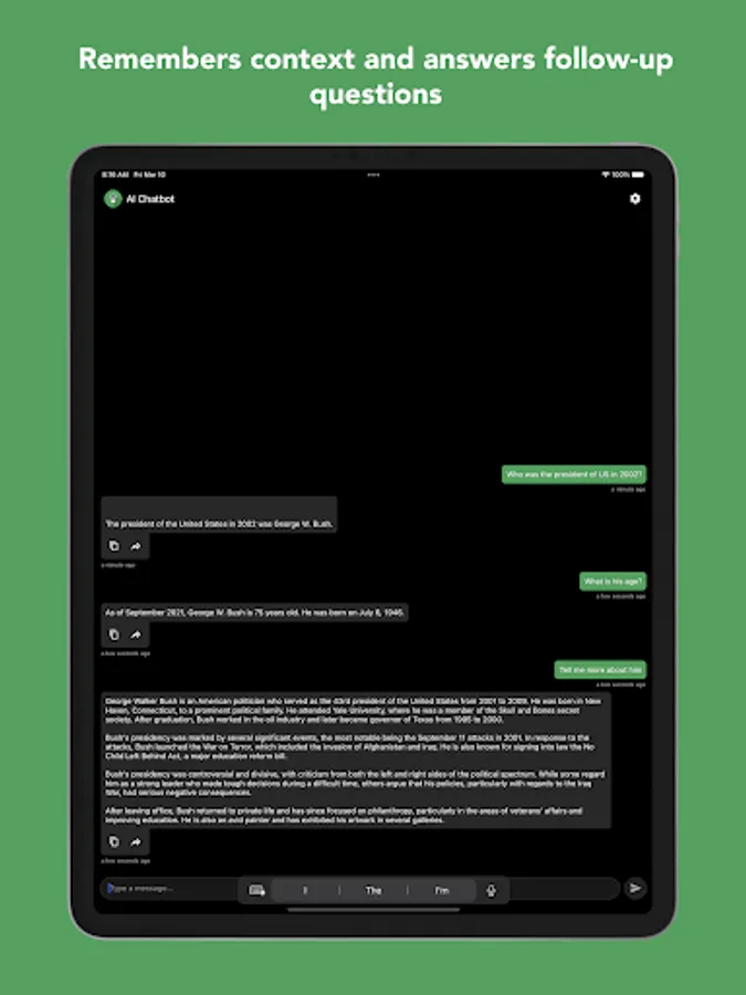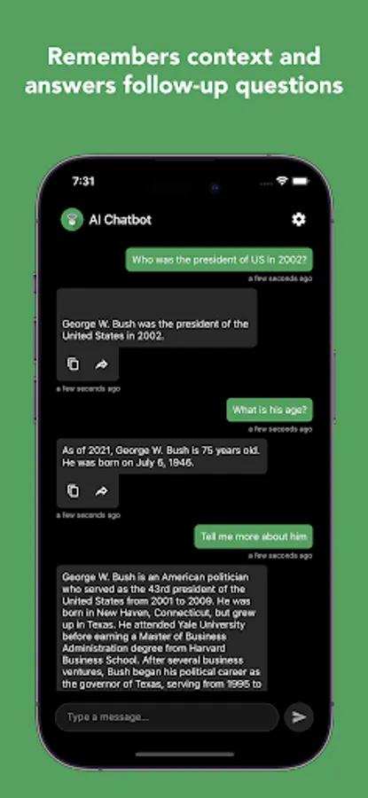 The first AI chatbot that remembers context and answers follow up questions. Ask anything and interact in a conversational way. Powered by OpenAI's ChatGPT APIs.