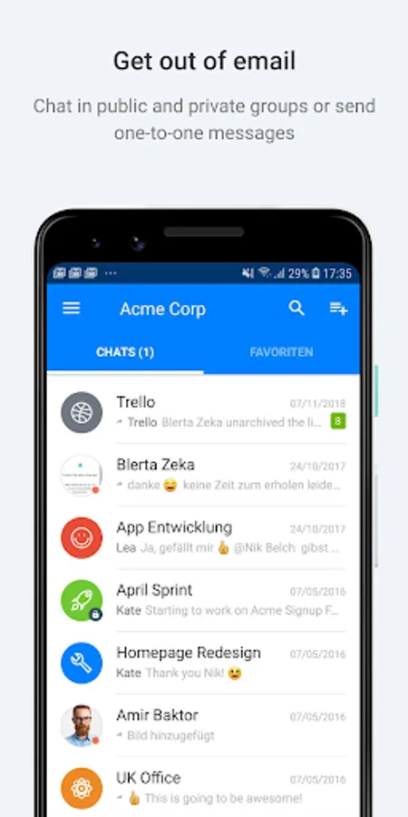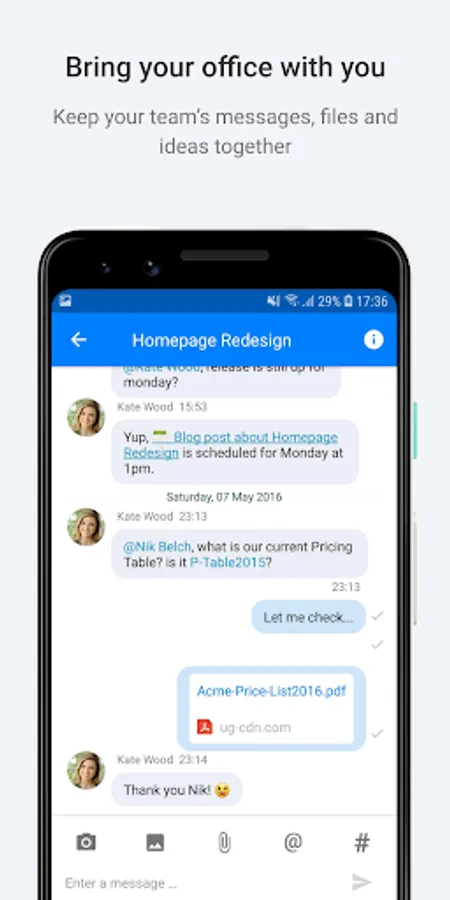 The Grape App for Android allows you to check on all your conversations while on the go. Get access to your rooms, private messages, and stay in touch with your colleagues and all activities from external services. All within a beautiful application built for your device with a particular focus on design.