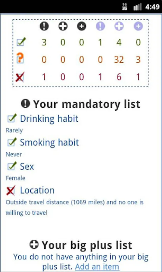 With 111 Dating checklist feature, you can create a checklist of what you are looking for and quickly weed out people who don't match your search criteria.