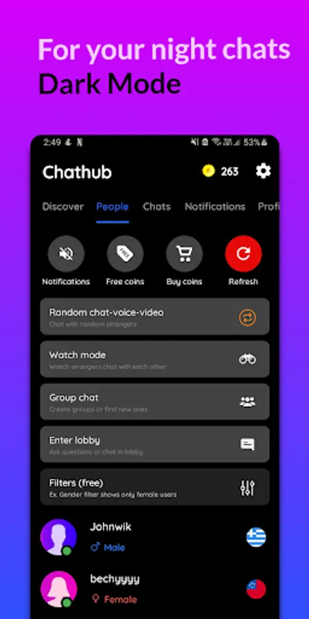 Chathub Audio Rooms does not require users to register or create an account to use the app. Users can simply download the app and start chatting with strangers right away. This feature makes it easy for users to connect with others and start chatting without any hassle.