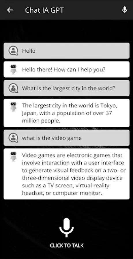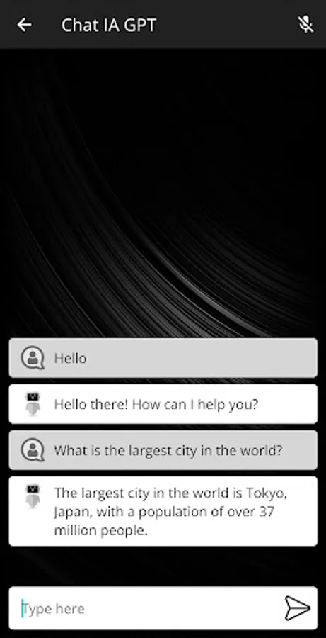 You can use Chat IA Free using the keyboard, typing and reading received messages, and also using voice, speaking and listening to received responses.