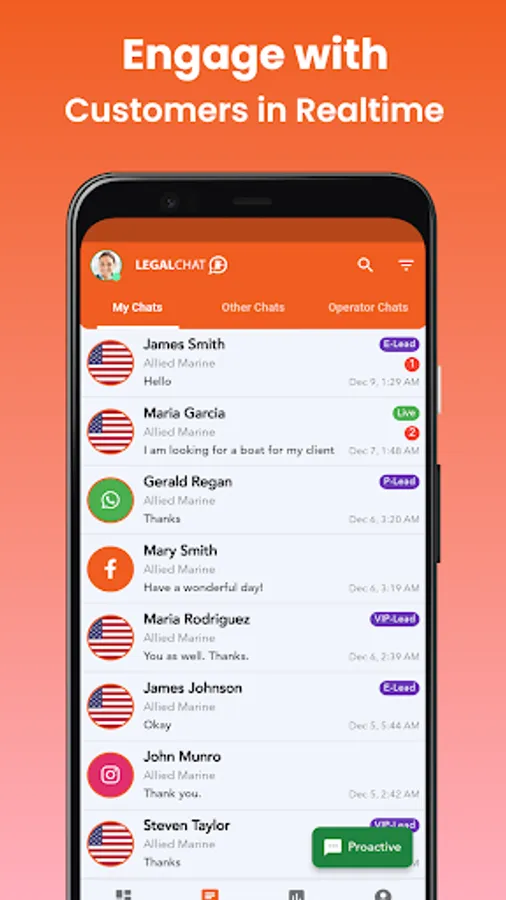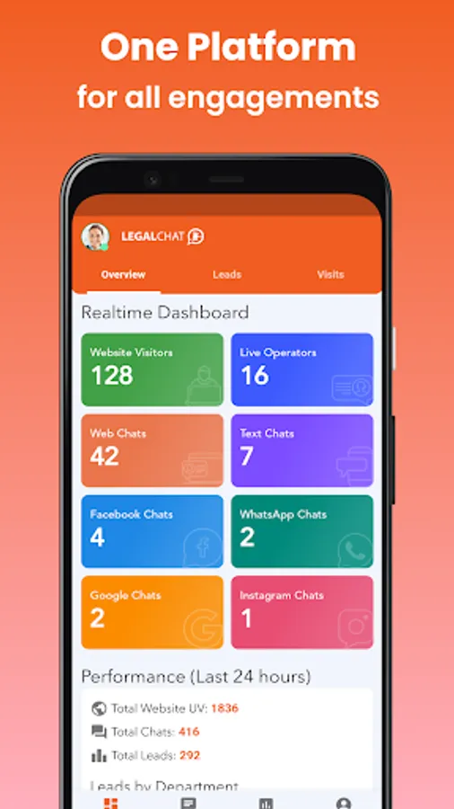 Operates on android marshmallow (v6.0) or later. LegalChat gives users the key tools of the desktop version. A far-reaching visit screen, pre-composed responses, automatically captures lead information and distributes lead notifications via SMS text, email or directly into the CRM. Law Firms can indicate hours of operation, view the visitors tracking detail, referring URL, search term that brought the visitor to the Law Firms website, and many other statistics.