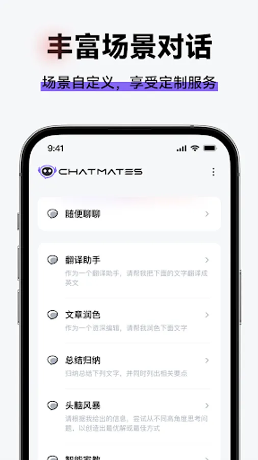 ChatMate has multiple preset scenarios, including: life, work, study and other themes, which can meet the needs of solving various problems in daily life. Users only need to choose the scene that suits them, and then they can enjoy intelligent services. In addition, users can also create their own scene dialogues and have exclusive assistants.