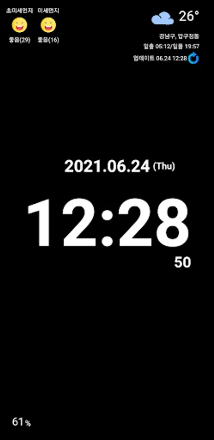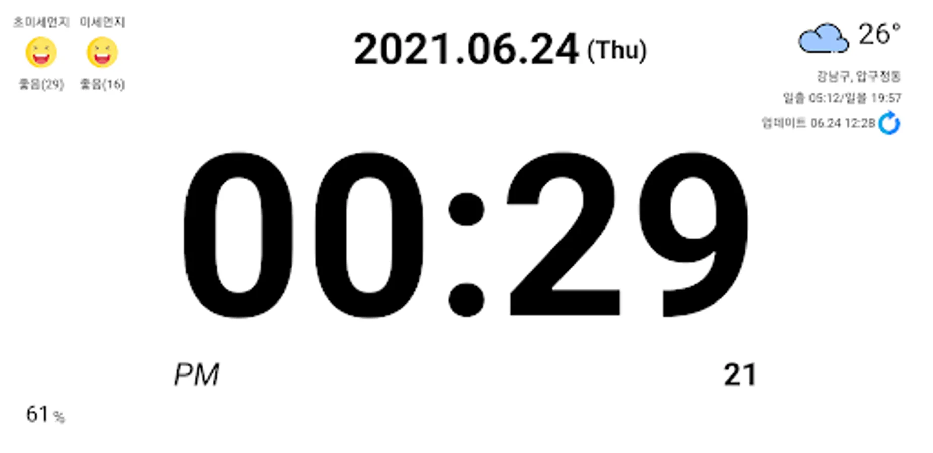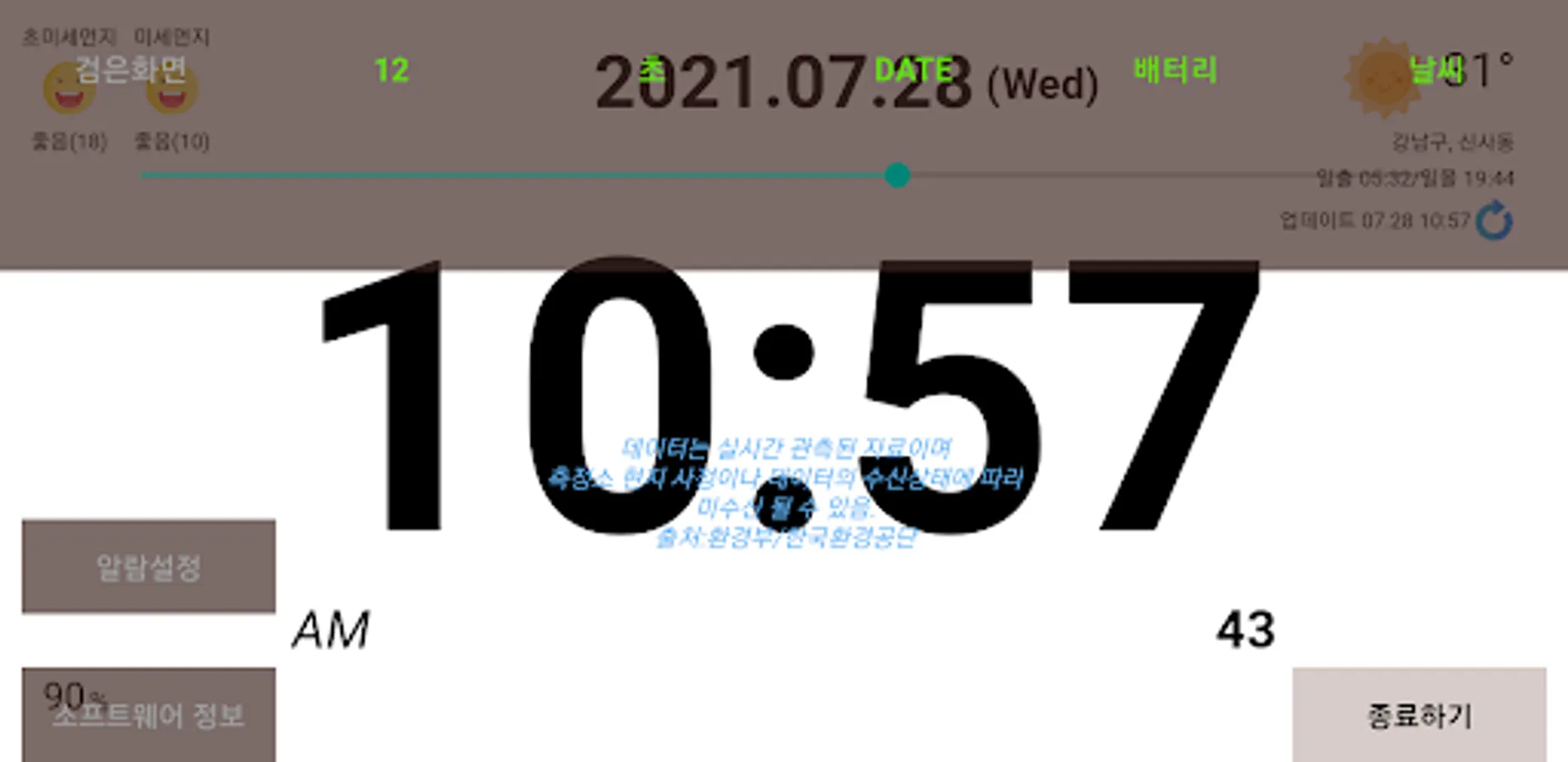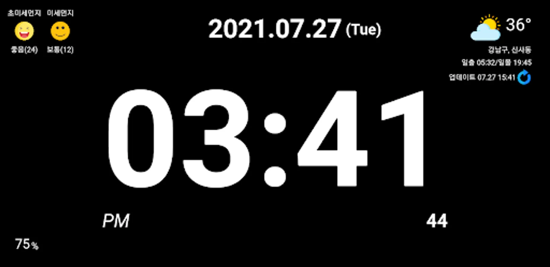 It provides alarm function, weather, fine dust, sunrise/sunset information.