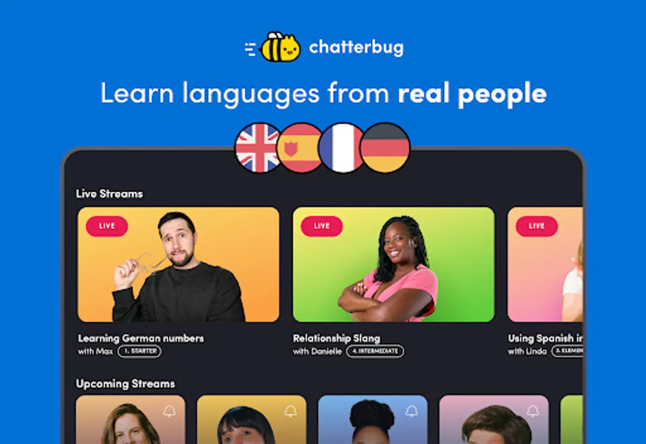 So don’t worry if you are at a beginner level or more advanced, we offer interactive and effective language learning live streams that are tailored to any level so you will learn languages at any stage of the learning process! We know that learning new languages is not easy and becoming fluent in the Spanish language, German or French takes a lot of time and practice but we offer a method to learn these languages at no cost! Chatterbug is the only app in the language learning industry that offers all the language learning live streams at no cost!