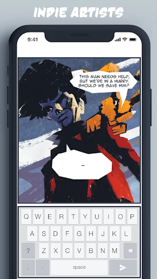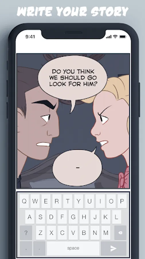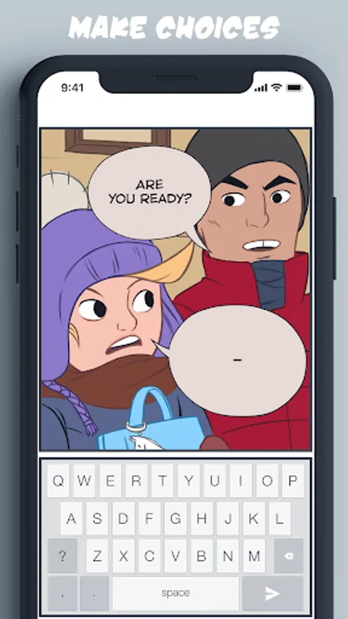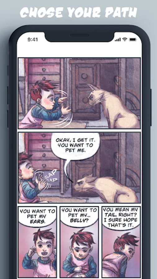 Swipe pages to read. Type some text into the speech balloon to move the story forward. You can always go back and re-write the story! Your choices have consequences and may lead to different endings.