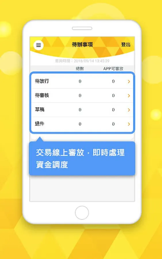 二、待辦事項:提供客戶其企業網路銀行具交易流程之案件,得至待審核作業 與待放行作業,就本服務提供之功能進行案件之查詢、審核或放行等服務。