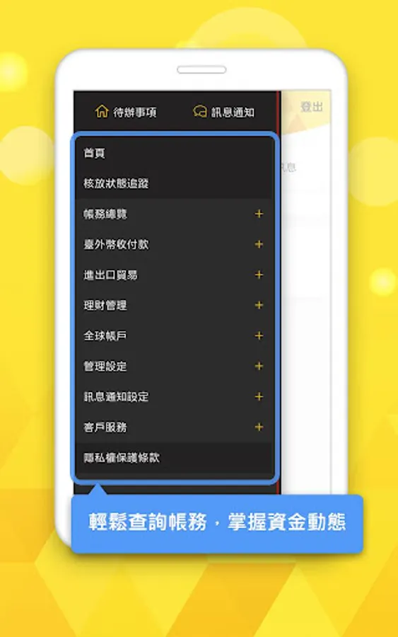 一、帳務總覽:提供本行新臺幣、外幣活存、定存、臺幣代收票據、存款餘額不足、貸款、基金、商務卡、進出口資料等帳務查詢服務。