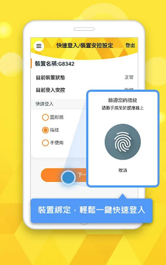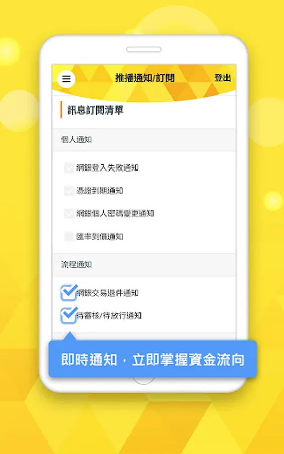 三、個人化服務:提供綁定行動裝置,使用指紋或圖型鎖認證即可快速登入,另提供推播訊息功能,即時掌握資金流向。