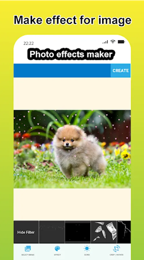 - The easy-to-use photo editor just selects the effect and icon then press the CREATE button. You will have a short video with shimmering effect for your photos.