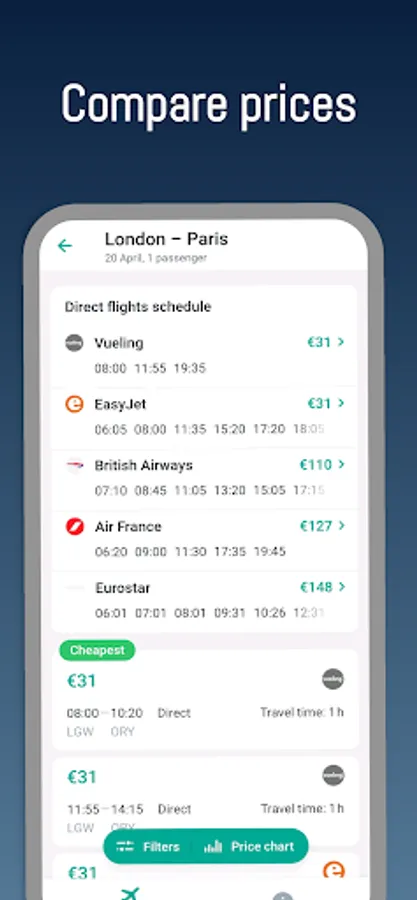 All major airways are compared in our cheap flights booking app. Save time and money by comparing and booking from your favorite travel brands like Spirit Airlines, United Airlines, and American Airlines all in one place, too Aegean airlines, Air baltic, Air canada, Air europa, Alitalia, American airlines, British airways, Delta, Easyjet, Emirates, Eurowings, Finnair, Latam, Neos air, Ryanair, Southwest, Transavia, United airlines, Volagratis, Volotea, Vueling, Wizz air, and many more low cost flights.