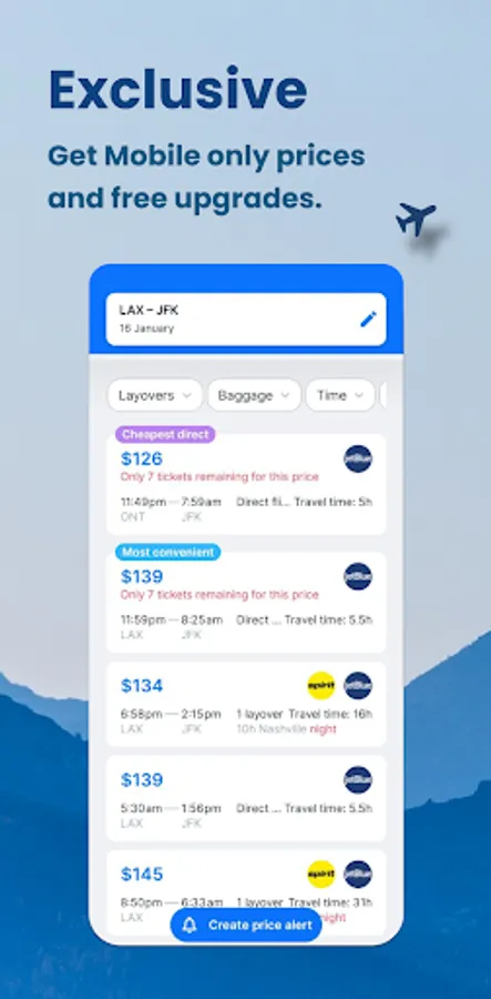 Our app allows you to compare prices from all major airlines, including American, JetBlue, Air Canada, Frontier, Air Transat, Westjet, British Airways, United, Delta, Allegiant, Alaska, Southwest, Spirit, Jetcost, Air India, Emirates, Cathay Pacific, Wizz Air, Cebu Pacific, Finnair, Vueling and more budget flights. With the flight finder app, you can filter search results by different parameters like flight date, arrival and departure times, number of stops, type of airline, distance from the terminal, flight duration, and price.