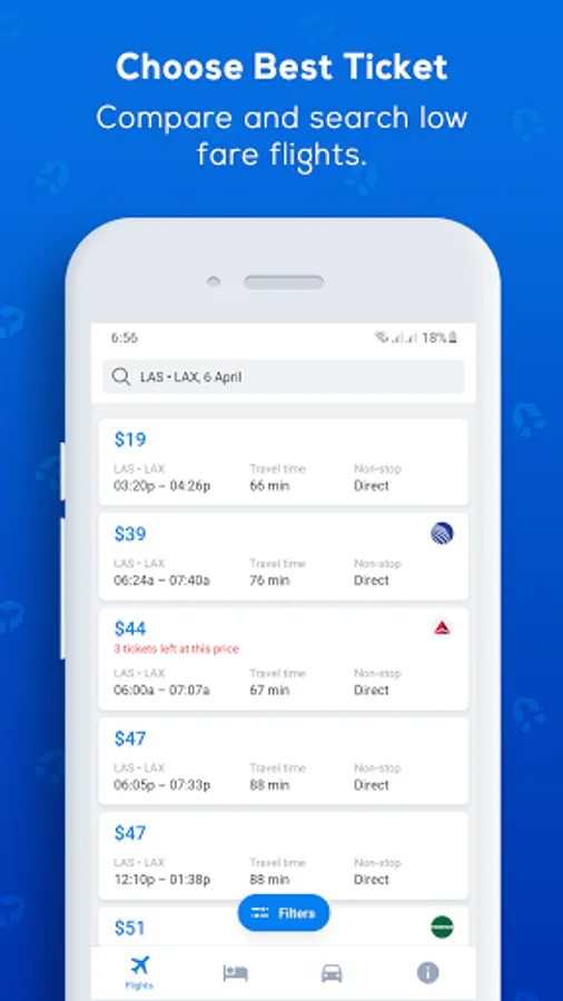 This is an easy-to-use cheap flights booking and hotel comparison flight app that shows flight information, current prices, filters for searches and other useful features.
