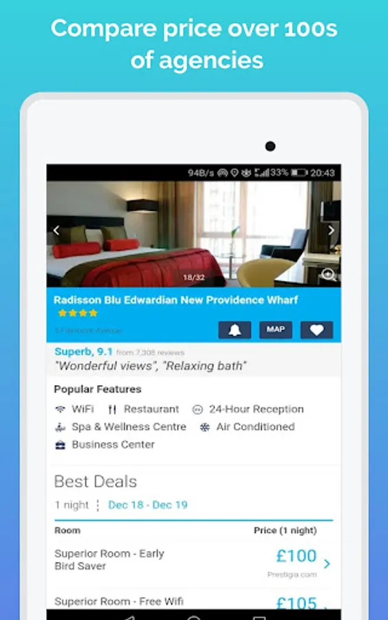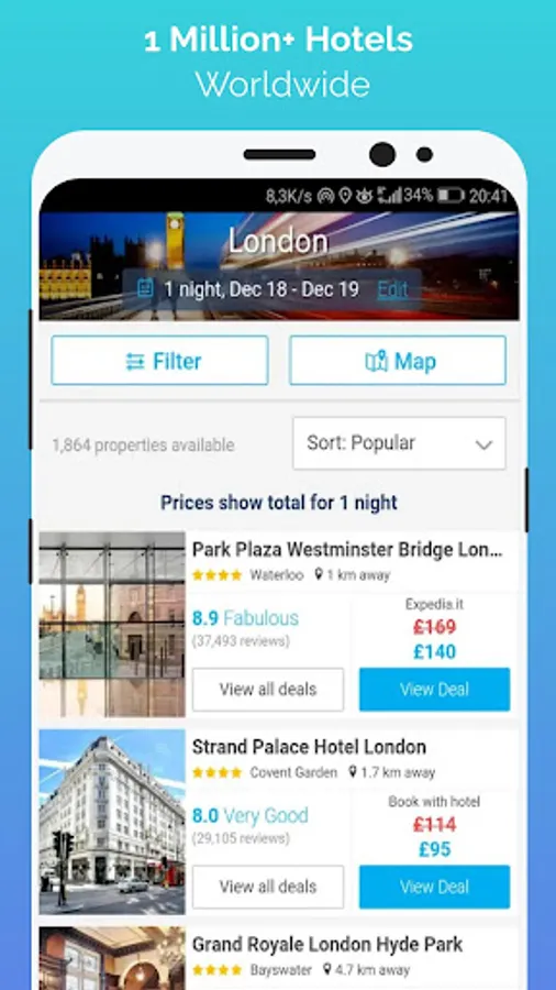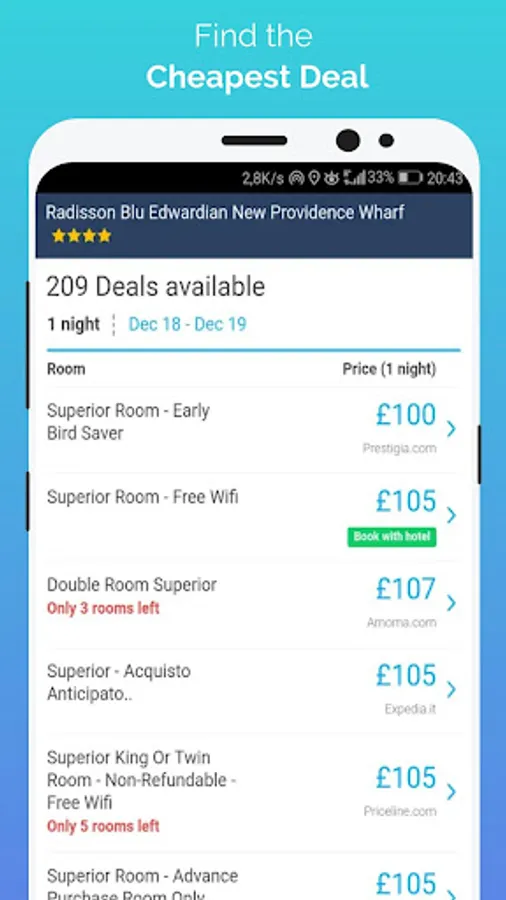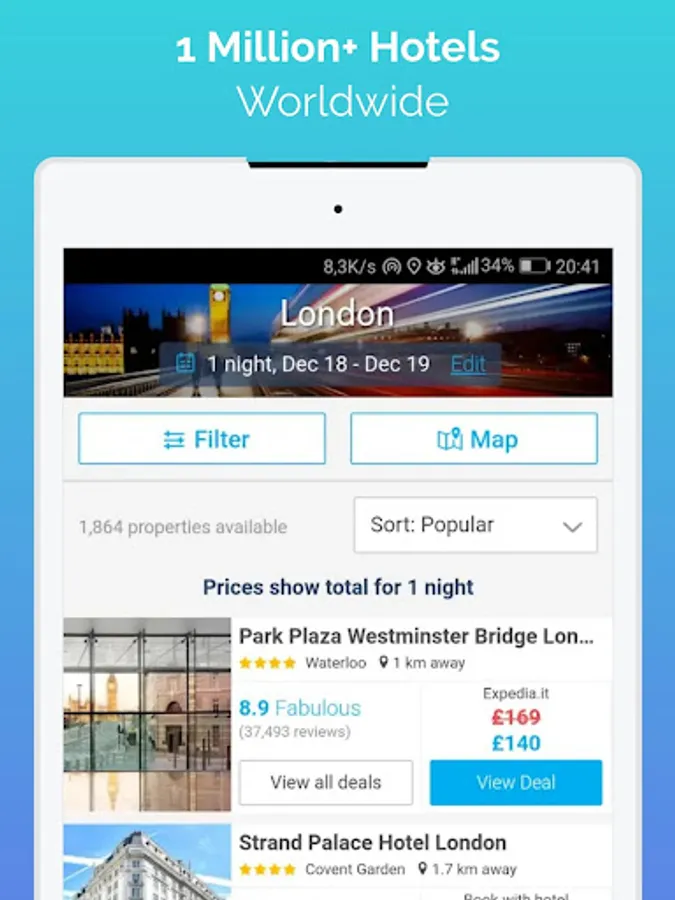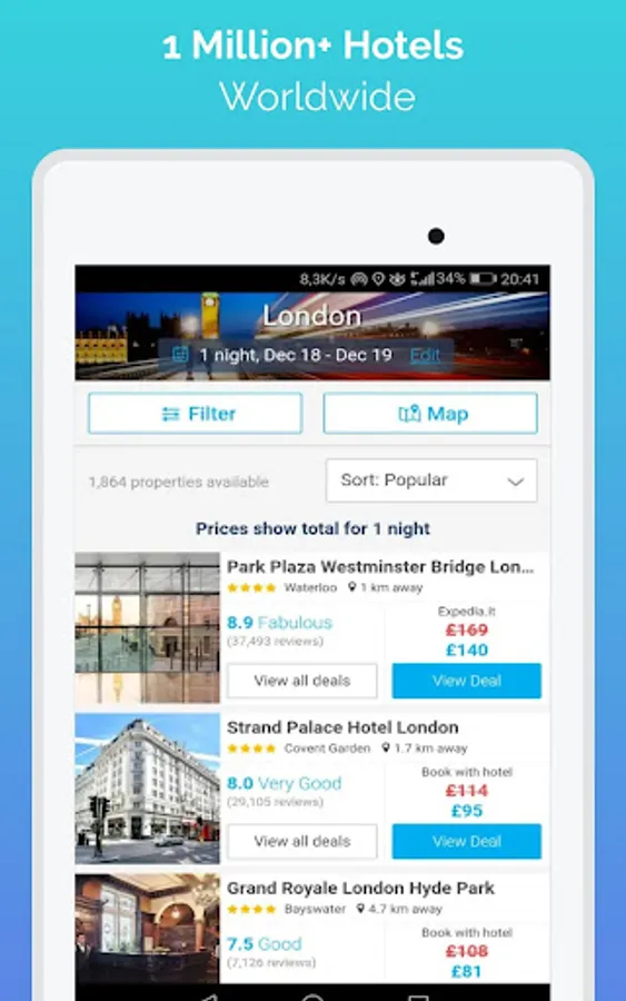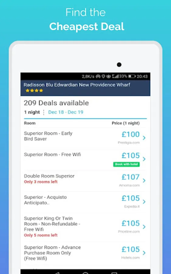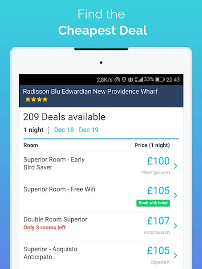 Cheap Hotel booking app is one of the best hotel booking engine available. here you can find the cheap hotels in a single click, we will do the rest for you. We compare the price of each hotel with 100s of online hotel booking portals and sort the best one for you with the least price noted. Our price comparison tool is completely free for anyone, so as a traveler you can save your money and time through us. We deliver you the hotel providers such as expedia, hotellook, hotelscombined, amoma, goeuro, omio, jetradar, aviasales, goibibo, makemytrip, traveloka, ctrip, scoosh, trivago, thomas cook, kayak, scot, wego, bookingbuddy, tripoto, Taj hotels, fab hotels and many are in this partner list. Cheap hotel app is the best class provider for holiday bookings, honeymoon stays, luxury resorts, homestay, motels, guest houses and bnbs.