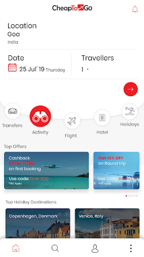 CheapToGo is a single platform for all your travel plan needs which is available on our website and mobile application. Available in six languages with currency conversion option offers ease in doing searches, planning and booking confirmations. Our commitment to customer support and satisfaction is provided through a dedicated helpline. Using the CheapToGo App, you will be able to search, plan and book your travel needs while availing discounts and exclusive loyalty offers with no hidden costs. Our services are in the area of (i) Flight Booking: We offer airfare at the lowest and discounted rates with no hidden charges for both domestic and international tickets. Features on offer that makes flight booking amazing includes price comparison, travel insurance, currency conversion, language select options, easy cancellation with refunds with rebooking options — instant notification to keep you updated on your booking and flight status. You can experience more offers on our multi-day packages and avail the best offers for you. (ii) Hotels and Holidays: Sales on hotel rooms will be offered in this section with options to compare according to star ratings, price, location, amenities. Free cancellation with instant notification to update your booking status. (iii) Transfers: Local travel arranged at a budget from the airport, transport hub, inter-city or tourist sites. Meeting and pick up directly from airport with choice of car type – micro, mini, compact, mid-size, executive and luxury. Hassle-free booking, pick and drop facility options to choose from at budget price. (iv) Activities: Whether you are on a one day visit or an extended holiday, the best event to spend your time is listed. Activities range from a balloon tour to dance, excursion, concert, water sports, cultural trips to other exquisite options to suit the taste of all. Activity tour duration is from 2 hours to 15 hours. (v) Group Booking: Book for a group of four or more and enjoy exclusive benefits. Buying tickets in bulk can help save money and stress. When booking bulk tickets at least 30 days in advance, we give you the option to pay in instalments. So, while you sit back and relax, let us do all the hard work and make your travel seamless and hassle-free.