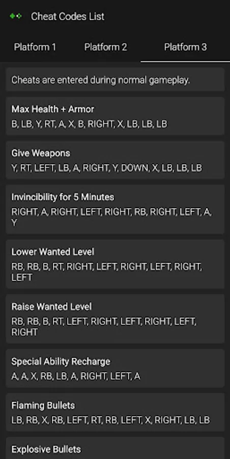 Just open the Cheats Codes List auto app, check which platform suits you and use official cheat codes.