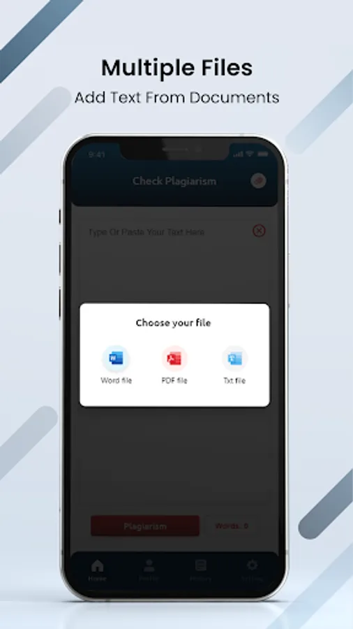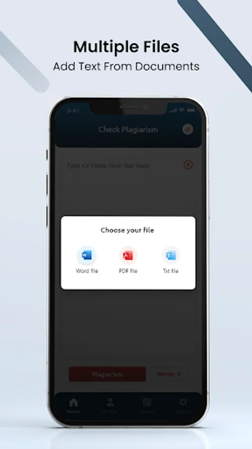 - Accepts three file formats (Word, Text, PDF) for uploading.