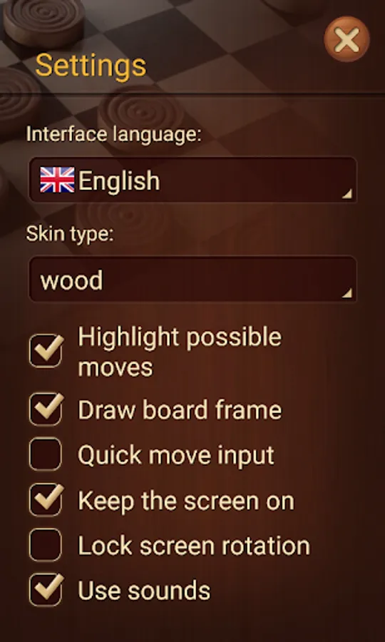 - Additional useful settings: possible move highlighting, quick move selection, disable screen dimming or deny screen auto-rotation