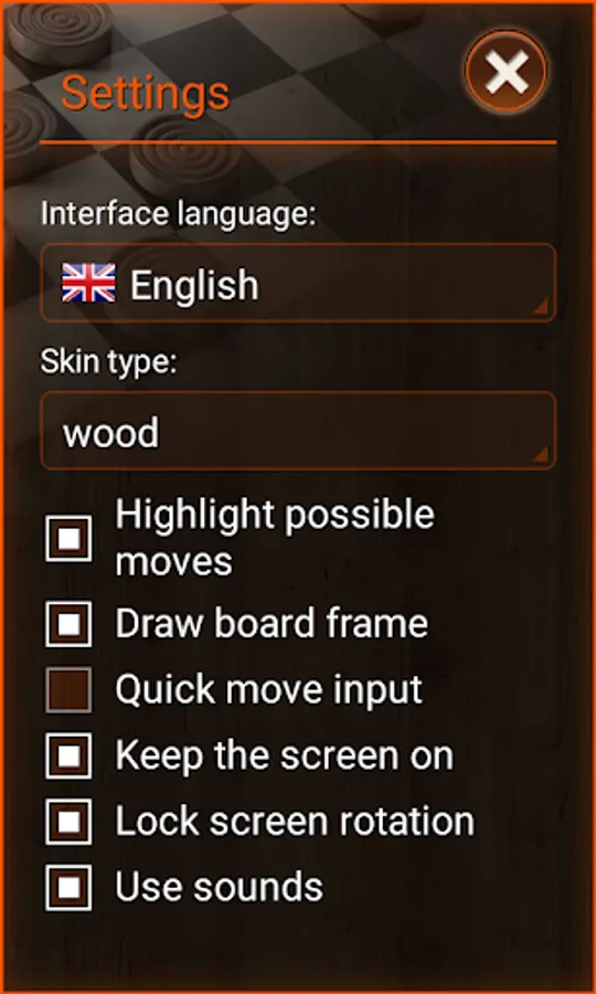 * Additional useful settings: sound, possible move highlighting, quick move selection, disable screen dimming or deny screen auto-rotation
