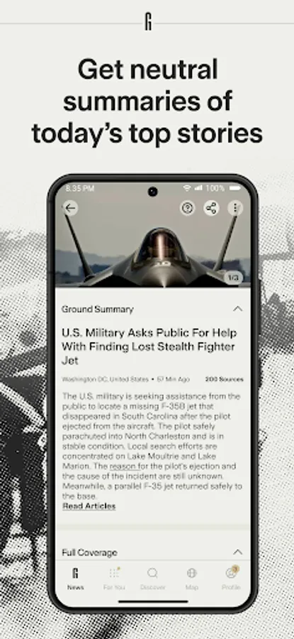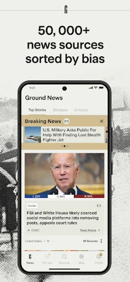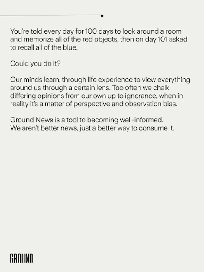 Ground News is the largest news aggregator in the world with over 50K news sources and 60K articles added daily. But we aren’t a typical news aggregator, throwing hundreds of headlines at you that barely skim the surface. Ground frees people from algorithmic restraints, illuminates blindspots and makes media bias explicit with our one-of-a-kind media analysis features.