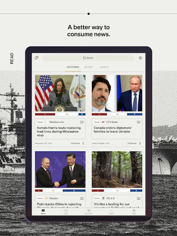 Read daily breaking stories from sources around the world, in real time. Like a modern day newspaper, we show you diverse stories instead of algorithm-driven content that can limit your worldview. News coverage is rarely unbiased, so we give you as much context as possible so you can come to your own conclusions. Compare coverage on partisan topics like politics, and elections.