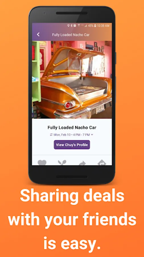 Search through restaurant and bar menus, call for reservations, save your favorite food and drink deals to your ‘liked deals’, and share it all easily with friends! You can sort through local happy hours and food specials on the basis of time, distance or popularity.